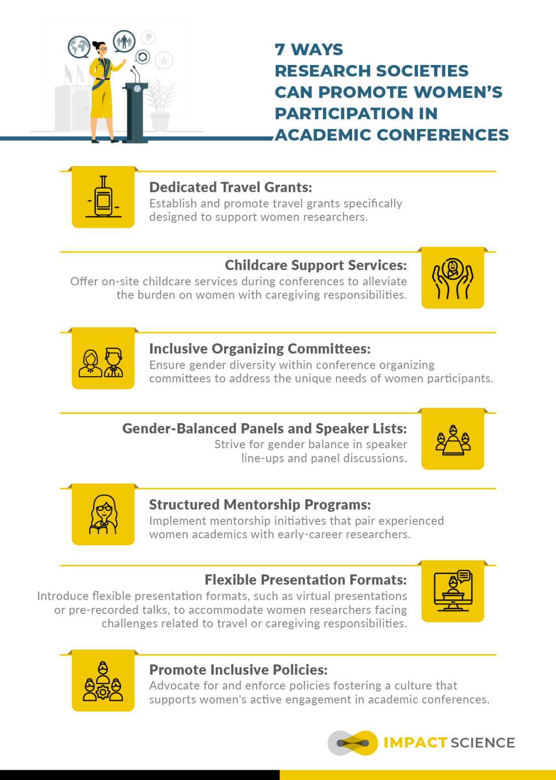 This infographic explores concrete strategies to dismantle barriers and enhance the participation of women in academic conferences. Embracing these measures not only amplifies the contributions of women in academic spheres but also fosters a more robust and equitable scholarly community.