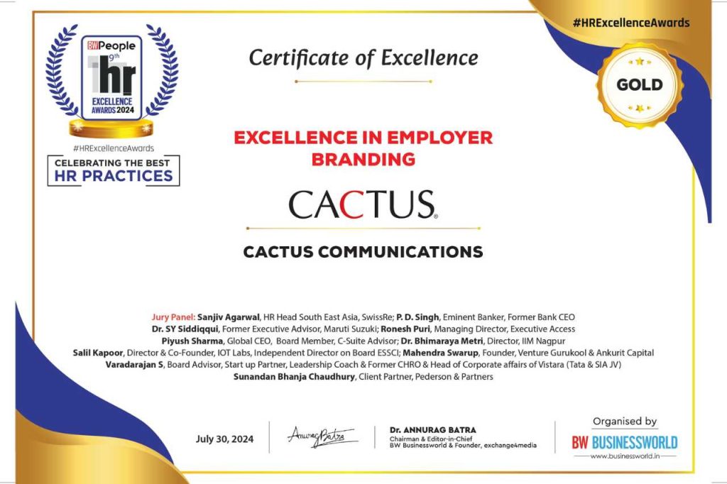 Cactus Communications (CACTUS), a leading science communication and technology company, is thrilled to announce that it has won the Gold Award for Excellence in Employer Branding at the prestigious BW People HR Excellence Awards 2024. This award recognizes CACTUS’s remarkable efforts in building an exceptional workplace culture and brand aimed at attracting and retaining specialized talent from academia, pharma, tech, and corporate sectors globally.