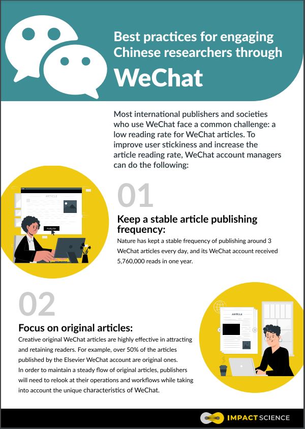 China has grown to be a key player in the global research market, with its increasing research investment and output. The country’s total expenditure for research and development in 2019 was USD 322 billion. According to the 2022 Nature Index Annual Tables, China was second in research output only to the US. For this reason, academic publishers and societies have begun to expand their presence in China and are trying to engage with Chinese researchers more actively. This requires the use of China-specific social media platforms, among which WeChat easily stands out due to its popularity and “all-in-one” approach.