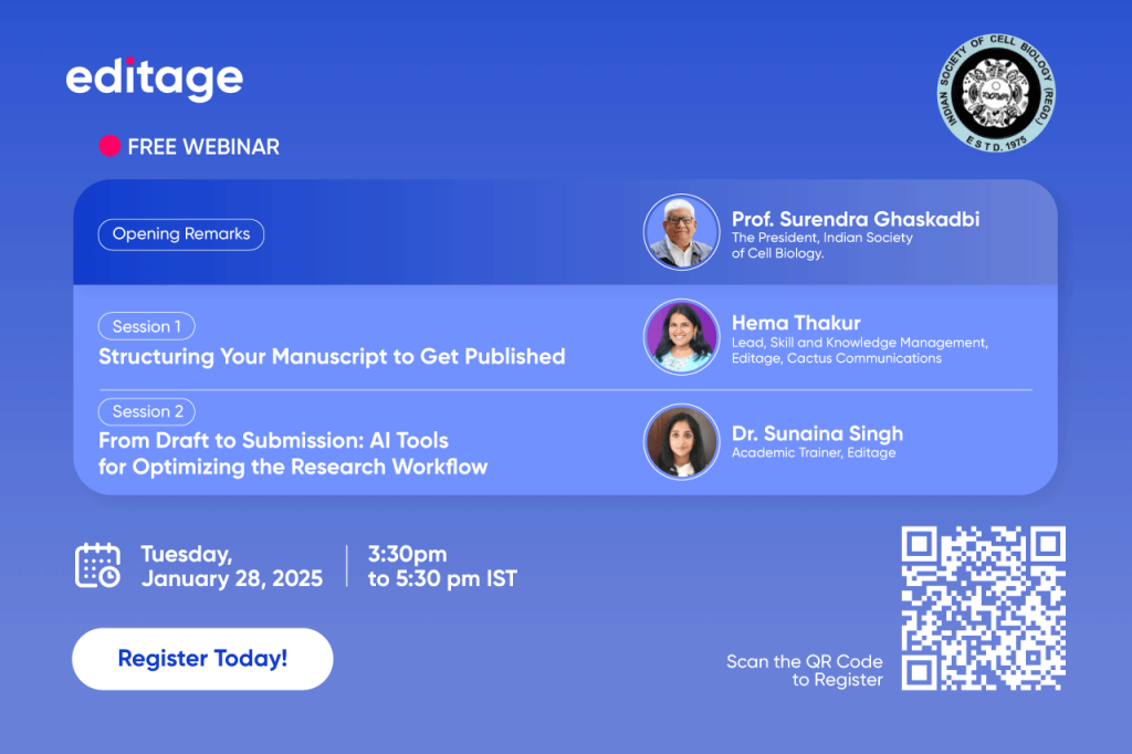 Editage, the flagship brand of Cactus Communications (CACTUS), in association with Indian Society of Cell Biology, is set to host an engaging session titled ‘Optimizing Research: Structuring Manuscripts & Leveraging AI’. The free online session is designed to empower researchers with the knowledge and tools to enhance their manuscript preparation process and optimize research workflows using technologies such as AI. The event will be held virtually on Tuesday, January 28, 2025, from 3:30 PM to 5:30 PM IST.